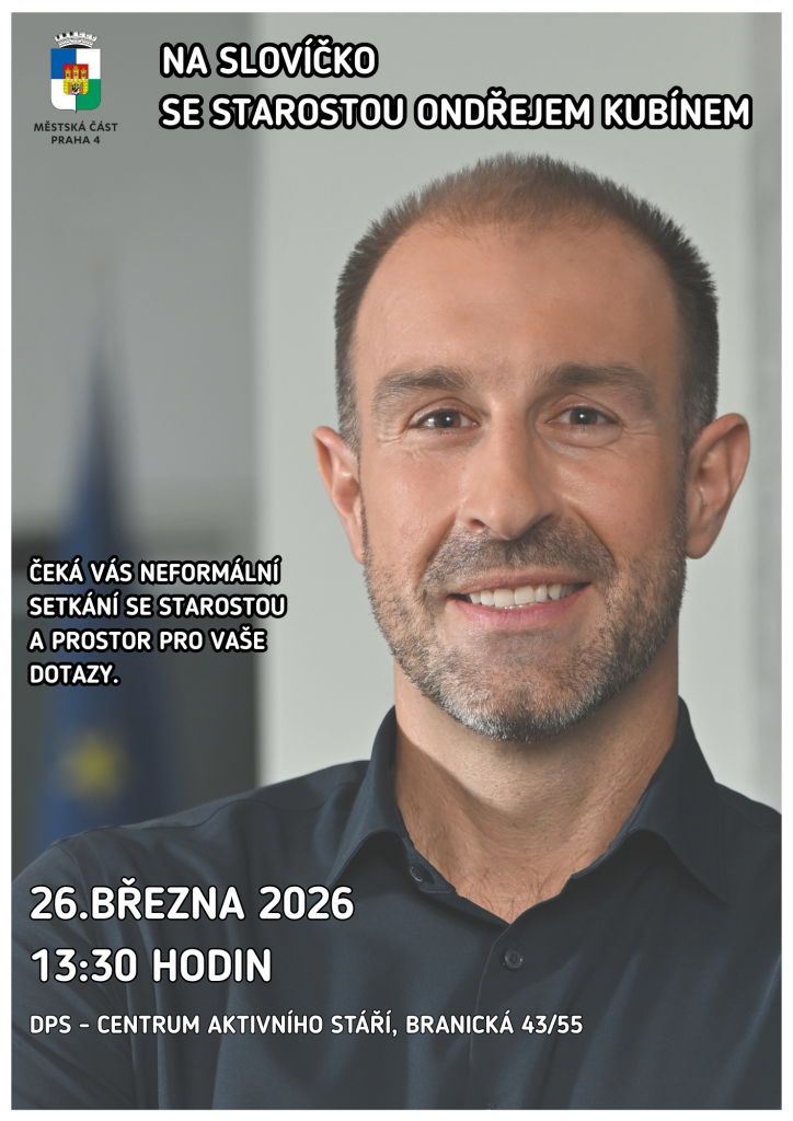 Městská část Praha 4 vás zve na neformální setkání se starostou Ondřejem Kubínem (ODS), se kterým si budete moci povídat o tématech, která vás zajímají a trápí, o aktuálních projektech, plánovaném rozvoji a o tom, co by se podle vás mělo v Praze 4 zlepšit.
