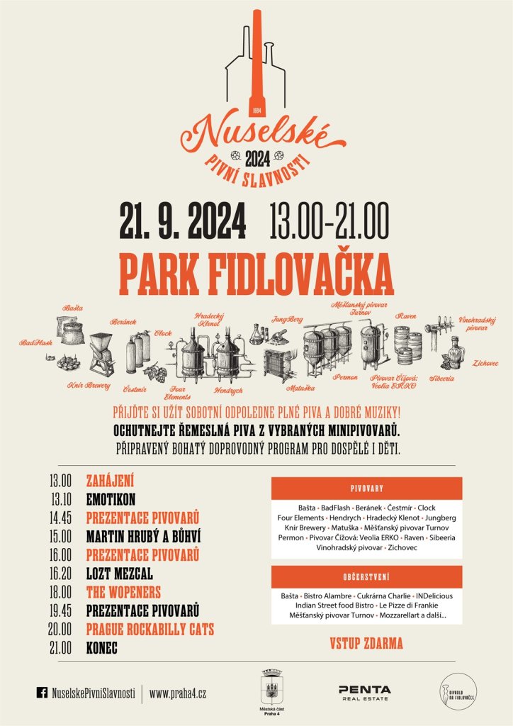 V parku Fidlovačka se v sobotu 21. září 2024 od 13 do 21 hodin uskuteční další ročník Nuselských pivních slavností. Pro návštěvníky bude připraven velký výběr nejen zlatavého moku od menších i větších minipivovarů, slušná porce hudby, ale také zajímavá gastronomie.