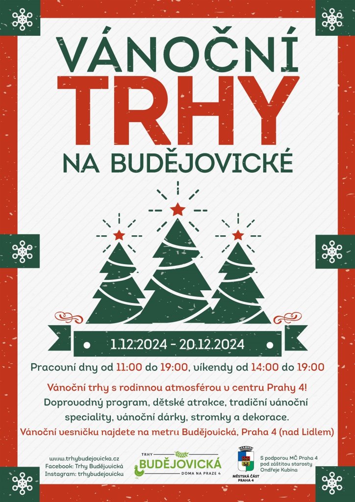 Vánoční trhy na Budějovické jsou po roce opět zde. Vánoční "vesničku" najdete od 1. do 20. prosince 2024 nad metrem Budějovická v prostoru za parkovištěm Lidlu. Čeká na vás zde doprovodný porgram, dětské atrakce, tradiční vánoční speciality i možné dárky pro vaše bližní.